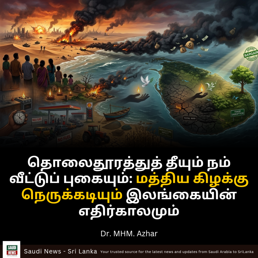 ✍️ Dr. MHM. Azhar மத்திய கிழக்கின் பாலைவனங்களில் வெடிக்கும் குண்டுகளின் சத்தம், ஆயிரக்கணக்கான மைல்களுக்கு அப்பால் உள்ள எமது தீவு தேசத்தின் வாழ்வாதாரத்தை நிலைகுலையச் செய்கிறது. இது வெறும் புவிசார் அரசியல் செய்தியல்ல;... Continue reading